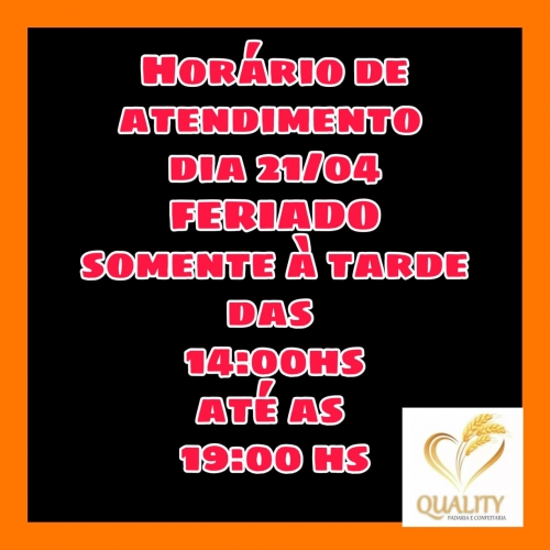 Comercial - 20/04/2020 - Confira o horário de atendimento da Padaria Quality nesta terça, feriado
