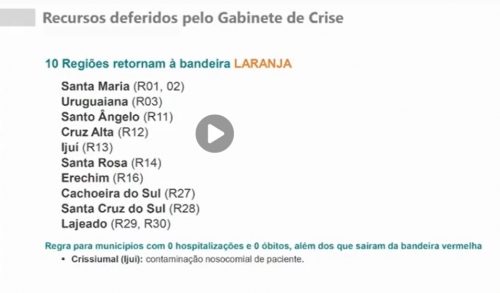 A informação foi confirmada pelo governador Eduardo Leite em live realizada no final da tarde desta segunda-feira (20/07), onde foram apresentadas as bandeiras definitivas. Ele chegou a citar o município de Crissiumal como único município que teve recurso atendido, as demais regiões que mudaram de bandeira ocorreram em virtude de recursos regionais.