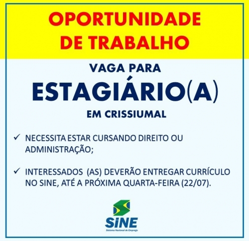 Geral - 20/07/2020 - Vaga para estagiário(a) que esteja cursando Direito ou Administração