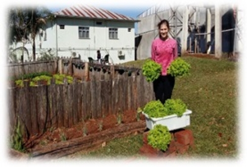 Fotos da horta do Hospital de Caridade de Três Passos (A); Colheita da alface pela bolsista do projeto “Horta é saúde”, Maiqueli Patrícia Ehrembrink (B).
