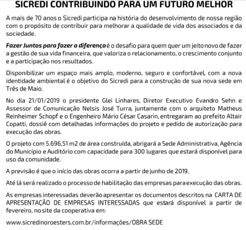 Comercial - 21/01/2019 - Sicredi divulga informações da nova sede que será construída em Três de Maio
