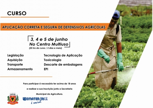 A Secretaria Municipal da Agricultura juntamente com a Emater/RS-Ascar e o Senar, convidam a todos os interessados para participar de um importante curso sobre a aplicação correta e segura de defensivos agrícolas. O curso será ministrado pelo instrutor Celso Prevedelo nos dias 3, 4 e 5 de junho, com início da programação às 9h00min, no centro Multiuso de Nova Candelária.