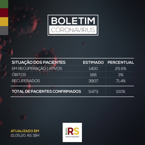 Além destes, a SES contabilizou os óbitos que ocorreram em Garibaldi, Porto Alegre e Lajeado nessa quarta-feira. Também foi confirmado, ontem, a morte de uma idosa de 78 anos residente de Gravataí. Com isso, o número de mortos pelo Covid-19 no Estado chega a 166, conforme os dados da Secretaria.
