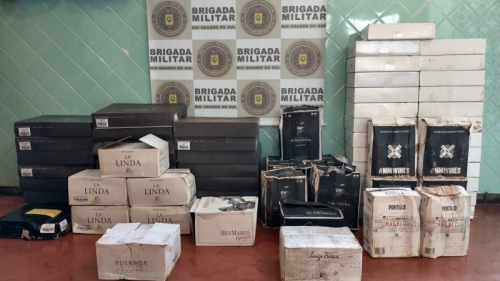 Foram efetuadas buscas, porém, não foi localizado. No interior do veículo foram encontradas 70 caixas de vinho, de distintas marcas, totalizando 343 garrafas.