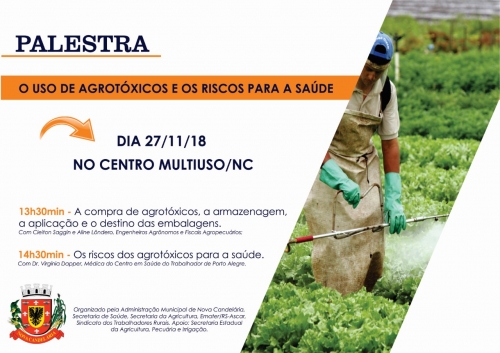 Com início às 13h30min, ministrada pelo Engenheiro Agrônomo Cleiton Douglas Saggin e pela Engenheira Agrônoma Aline Lôndero, Fiscais Agropecuários da Secretaria Estadual da Agricultura, haverá uma palestra sobre a compra dos agrotóxicos, a armazenagem, a aplicação e o destino das embalagens. A partir das 14h30min, a palestra abordará os riscos dos agrotóxicos para a saúde da população, com a Dr. Virgínia Dapper, médica no Centro de Referência do Trabalhador de Porto Alegre.