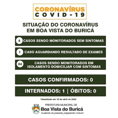 A Secretaria Municipal de Saúde informou nessa quarta-feira (22) que deu NEGATIVO o resultado do exame feito em um paciente com suspeita de Covid-19 em Boa Vista do Buricá.
