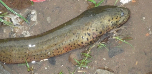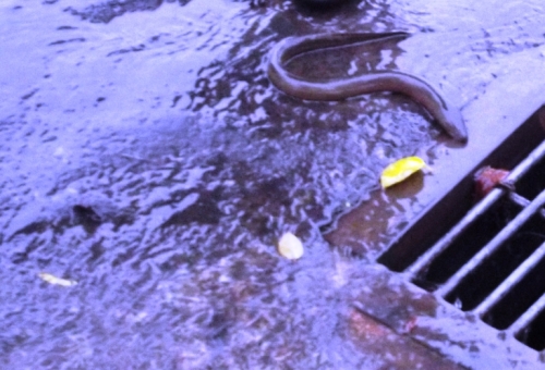 Um muçum, também conhecido como peixe cobra e enguia de água doce descia a Rua Iraí, nadando e se rastejando pela lateral da rua, onde escoa a água.