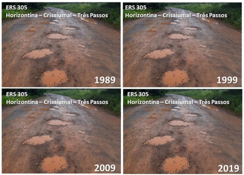 Depois de ter um parcial serviço de encascalhamento no ano passado antes das eleições, a ERS 305, ou continua horrível, na parte que não foi atingida pela obra, entre Crissiumal e Três Passos, ou está terrível, na parte encascalhada e que está com o material soltando desde dezembro, com crateras e muitas pedras soltas.