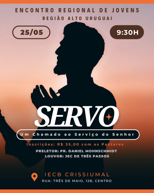 As 9h30min dar-se-á o inicio da programação espiritual - Culto Jovem que será celebrado nas dependências do Templo da IECB de Crissiumal. Endereço: Rua Três de Maio, Nº 128, Centro, Crissiumal/RS. O tema deste ano será: Servo – Um Chamado ao Serviço do Senhor - tema este que, em consonância ao lema geral da IECB, conclama cada jovem a ouvir e atender o chamado de Deus para sua vida. O Palestrante será o Pr. Daniel Mohnschmidt, pastor da IECB de Três de Maio/RS e o Louvor estará a cargo do Grupo de Louvor da Juventude Evangélica Congregacional de Três Passos/RS.