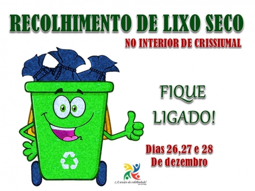 Dia 26 de dezembro, terça-feira, acontecerá o recolhimento de lixo seco, nas localidades de: Lajeado Crissiumal, Alto Crissiumal, Lajeado Grande, Santo Antônio, Linha Concórdia, Linha Principal, Esquina Butiá, Zona Quantz, Lajeado Guabirova, São Sebastião, Boa esperança, Lajeado Caçador, Barra do Mirim e Lajeado Teimoso.