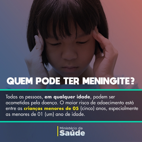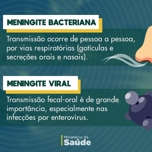 A meningite viral costuma afetar crianças de até cinco anos e a forma bacteriana da doença geralmente atinge adultos na casa dos 20 anos. Na meningite bacteriana, geralmente, a transmissão é de pessoa a pessoa, por meio das vias respiratórias, por gotículas e secreções das vias aéreas superiores (do nariz e da garganta). Já na meningite viral a transmissão fecal-oral é de grande importância, especialmente nas infecções por enterovírus.