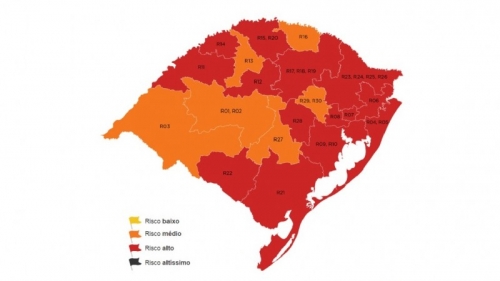 O mapa preliminar da 12ª rodada do Distanciamento Controlado volta a trazer mais da metade das 20 regiões em bandeira vermelha (risco alto). De oito regiões classificadas em vermelho na 11ª rodada, o Estado tem, agora, 14 regiões com risco alto para o contágio por coronavírus: Caxias do Sul, Taquara, Canoas, Porto Alegre, Pelotas, Santa Rosa, Santa Cruz do Sul, Capão da Canoa, Novo Hamburgo, Cruz Alta, Bagé, Passo Fundo, Palmeira das Missões e Santo Ângelo.