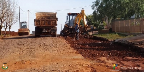 A equipe de Obras Públicas está efetuando o nivelamento da via, com a colocação de material e compactação, e, também, realizando a colocação dos cordões (guias), para agilizar o trabalho de asfaltamento, por parte da empresa.