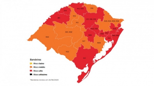 Divulgado na última sexta-feira (21/8), o mapa preliminar da 16ª rodada trazia 13 regiões com alto risco epidemiológico. Depois de análise dos 10 pedidos de reconsideração enviados por municípios e associações regionais, o Gabinete de Crise acatou apenas o recurso apresentado pela região Covid de Guaíba, resultando em nove bandeiras laranjas (risco médio) e 12 vermelhas.