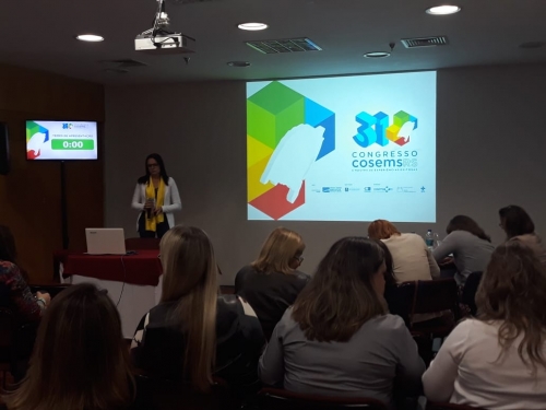 A secretária Suelen Cocco apresentou sua experiência na Feira de Soluções para Saúde, com a temática "Gestão de Recursos Humanos na Saúde".