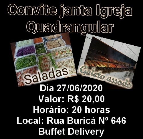 A Igreja Quadrangular promove neste sábado, dia 27 de junho, jantar (galeto com acompanhamentos) com buffet delivery, ao valor de R$ 20,00.