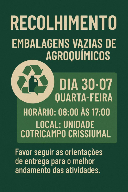 Acontecerá o Recolhimento de Embalagens de Agrotóxicos na: