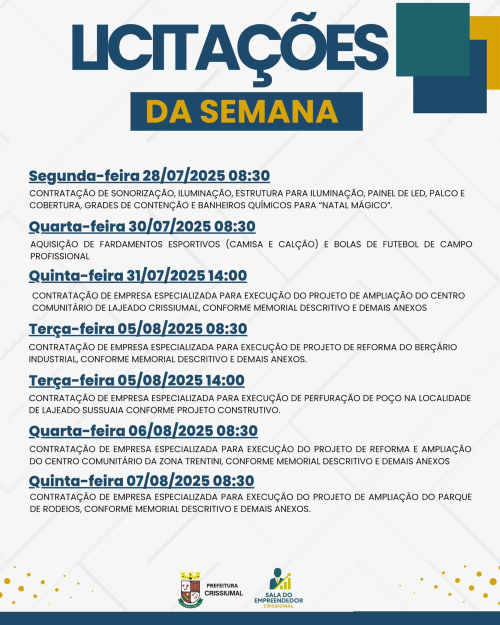 A Administração Municipal de Crissiumal divulgou nessa sexta-feira (25/07) as licitações programadas entre os dias 28 de julho e 07 de agosto de 2025.