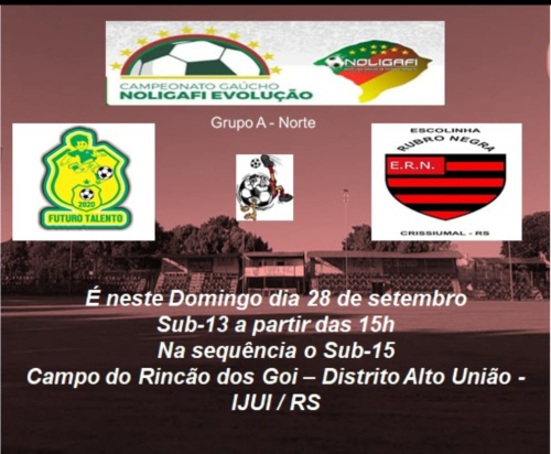 Durante a tarde, a partir das 15hs, os times sub-13 e sub-15 entram em campo diante do Futuro Talento Ijuí, no campo do Juventude do Rincão dos Gói. Ambos os times crissiumalenses estão classificados.