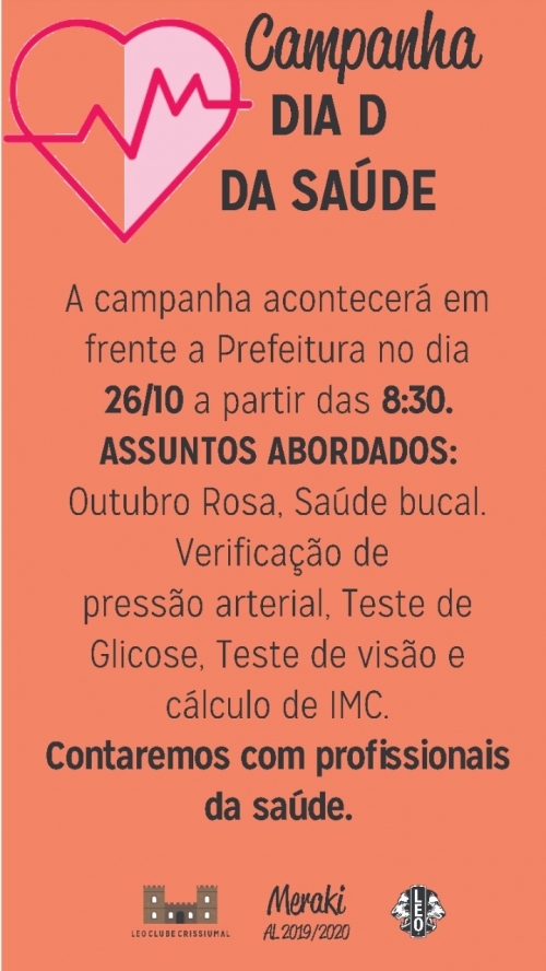 O LEO Clube Crissiumal, sempre engajado em causas sociais que auxiliam e trazem benefícios para a comunidade, organiza para o dia 26 de outubro, neste sábado, o DIA D da Saúde.