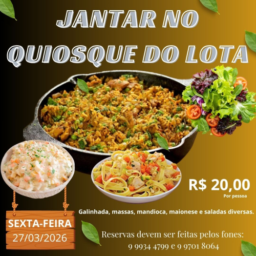Cardápio: Galinhada, massas, mandioca, maionese e saladas diversas.