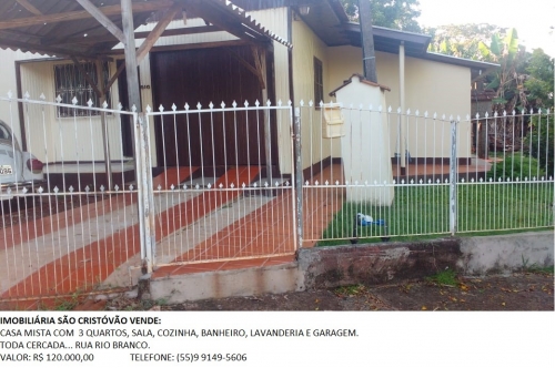 Imobiliária São Cristóvão vende casa mista, com 3 quartos, sala, cozinha, banheiro, lavanderia e garagem. Toda cercada, na Rua Rio Branco. valor R$ 120.000,00