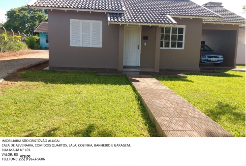 Imobiliária São Cristóvão aluga casa de alvenaria, com 2 quartos, sala, cozinha, banheiro e garagem, na Rua Mauá. Valor R$ 479,00