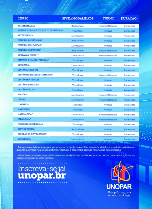 www.unopar.br e conheça mais de 20 opções de cursos.