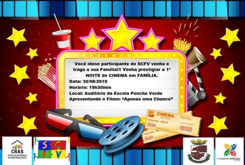 Com o objetivo de incentivar a socialização dos idosos e proporcionar um momento de descontração e alegria, junto com suas famílias, a Secretaria de Assistência e Desenvolvimento Social, em parceria com o CRAS, estará realizando a 1ª NOITE DO CINEMA EM FAMÍLIA, que acontecerá no auditório da Escola Ponche Verde, a partir das 19h30min.
