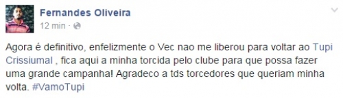Josemar postou em seu perfil no facebook ao meia dia desta terça-feira uma mensagem aos torcedores do Tupi: