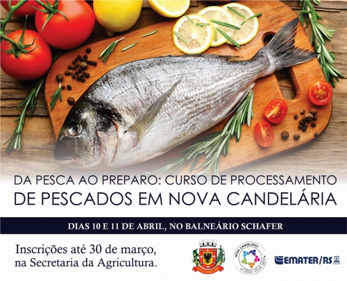 Pensando nisso, a Secretaria da Agricultura, Abastecimento e Meio Ambiente, em parceria com a Administração Municipal de Nova Candelária, com a Secretaria de Assistência Social e a Emater/RS-Ascar, oferece a todas as agroindústrias e produtores interessados, a oportunidade de participarem do curso de processamento de peixes, nos dias 10 e 11 de abril, no Balneário Schafer. O curso será ministrado pelo instrutor Miguel Starb e possui vagas limitadas. Interessados devem inscrever-se na Secretaria da Agricultura, até o dia 30 de março.