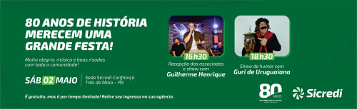 No mês de maio deste ano a Sicredi Confiança comemora 80 anos de história, cooperação e desenvolvimento regional. Para marcar essa trajetória construída junto aos associados e à comunidade, a cooperativa preparou uma programação especial, com atividades entre os dias 2, 3, 4 e 5 de maio, tendo como principal destaque o evento aberto a todos os associados no sábado, dia 2 de maio.