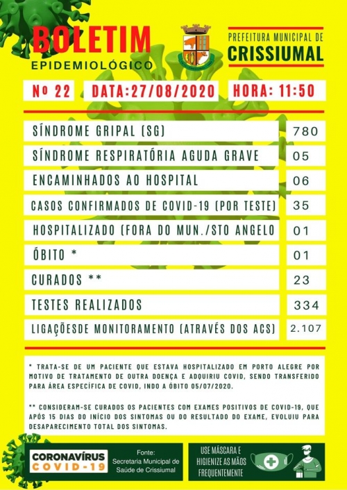 A prefeitura de Crissiumal divulgou nessa quinta-feira (27) o boletim informativo coronavírus nº22.