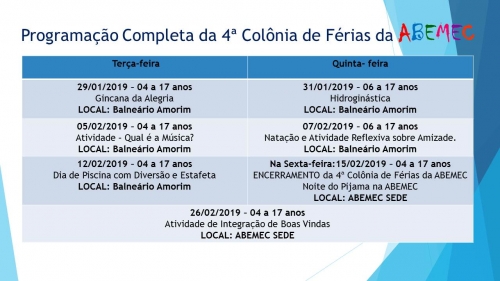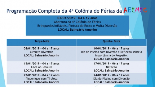 As atividades da colônia de férias acontecerão do dia 03/01 à 15/02/19 e visam à integração entre as crianças e adolescentes da ABEMEC Sede e Núcleos Bairro Mirim e Bairro Paraíso, com Momentos de Socialização, Roda da Convivência, Brincadeiras e muita Diversão, tendo como local das atividades o Balneário Amorim para o público de 06 à 17 anos que fazem parte do Serviço de Convivência e Fortalecimento de Vínculos (SCFV) e para o público de 04 e 05 anos que fazem parte do atendimento da Educação Infantil no turno inverso ao escolar.