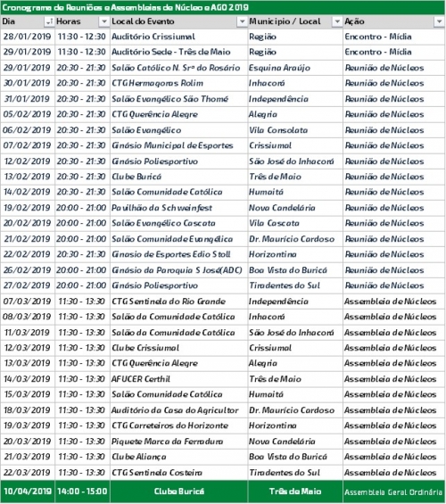 Nestas oportunidades a diretoria, em primeira mão, apresenta os conteúdos que serão informados aos associados nos eventos adiante indicados no Cronograma de Reuniões e Assembleias de Núcleos 2019.
