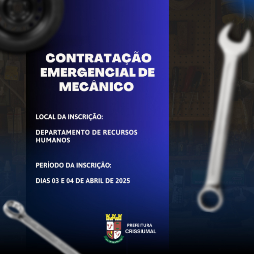 Estarão abertas as inscrições para a contratação emergencial de 01 (um) MECÂNICO, que irá atuar junto à Secretaria Municipal de Obras Públicas, Habitação, Saneamento e Trânsito.