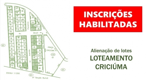 Foi divulgada nesta terça-feira, dia 28 de maio, a relação preliminar das inscrições habilitadas para a alienação dos 14 (quatorze) lotes disponíveis, pertencentes as Quadras 151, 152, 153 e 155, do Bairro Criciúma.
