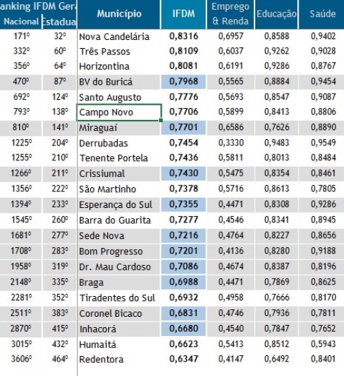 O Índice Firjan de Desenvolvimento Municipal (IFDM) 2018, divulgado hoje pela Federação das Indústrias do Rio de Janeiro, revela que 99% das cidades gaúchas (485 dos 490 municípios avaliados) atingiram nível de desenvolvimento alto ou moderado em 2016, ano-base do levantamento. Entre as 100 melhores de todo o País, há 18 do Rio Grande do Sul, valor que só é superado pelo estado de São Paulo. Além disso, nenhuma cidade gaúcha registra baixo desenvolvimento.