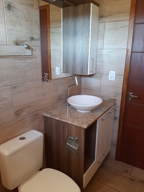 Parte de cima conta com 66,00 m², sendo 2 quartos, sala ampla, cozinha, banheiro, e escada de acesso ao porão;