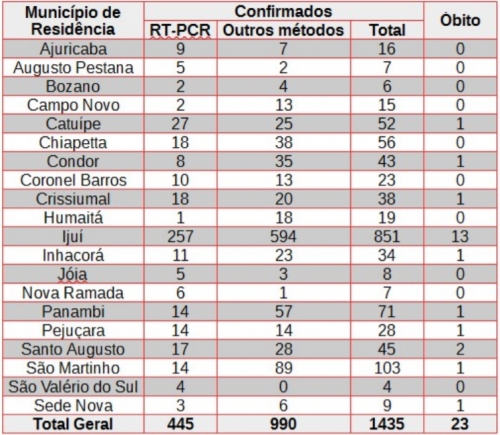 Dois pacientes estão na UTI, uma mulher em Santo Ângelo e um homem em Três Passos. A região R13 possui 1435 casos, com 23 óbitos, um deles em Crissiumal.