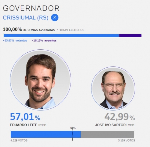 Eduardo Leite do PSDB venceu as eleições para Governador do Estado no município de Crissiumal nas eleições deste domingo (28), o segundo turno do pleito 2018.