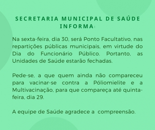 Essa quinta-feira (29) é o último dia para a vacinação de crianças contra a poliomielite em Crissiumal, uma vez que na sexta não haverá atendimento na Unidade de Saúde Municipal.