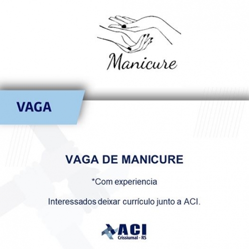 Oportunidade de emprego! Vaga para manicure. Interessados deixar currículo junto a ACI.
