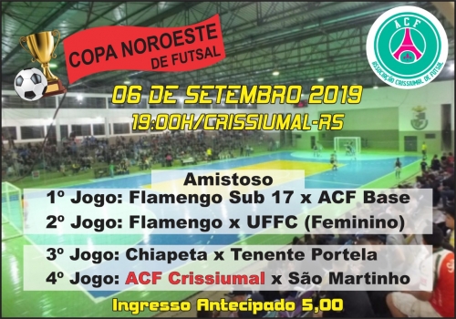 A AFC – Associação Futsal Crissiumal se organiza fora de quadra para a rodada da Copa Cresol Noroeste de Futsal, que acontecerá em Crissiumal no dia 06, onde haverão jogos amistosos e os jogos entre Chiapetta x Tenente Portela e Crissiumal x São Martinho. A programação completa você vê na imagem do topo.