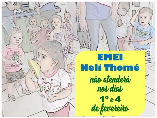 A Secretaria Municipal de Educação e Cultura de Crissiumal, informa que a EMEI Neli Ilse Thomé, do bairro Industrial, a qual realiza atendimento às crianças, desde o dia 02 de janeiro; estará fechada nos dias 1º e 04 de fevereiro, ou seja, na próxima sexta e segunda-feira.