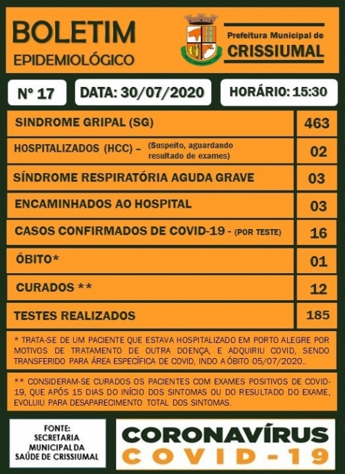 A boa notícia do boletim desta quinta-feira é de que em Crissiumal 12 dos 16 casos já são considerados curados. Até agora foram realizados 463 atendimentos e 185 testes. Uma pessoa morreu com a doença.