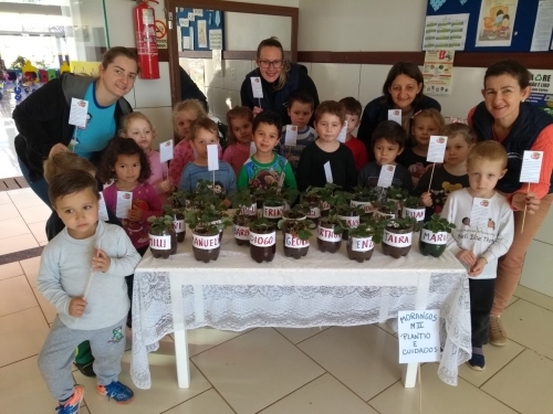 Estamos cultivando a coroa de um abacaxi e cada criança plantou seu próprio pé de morango os quais já estão florescendo e alguns dando frutos.