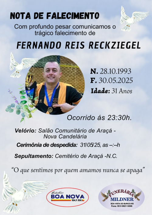 Jairo Luiz Reis, treinador de muito sucesso no futebol regional, hoje Diretor do CMD de Nova Candelária e tio de Fernando definiu o momento em suas redes sociais: “Por um momento assim penso que nenhum ser humano deveria passar......penso que ainda não seja verdade....fostes aqui na vivência com nossa família e com os amigos o elo da mais pura simplicidade e resiliência que já vi em um ser humano....não terá como preencher esse vazio...um vazio físico de alegria e alto astral...hoje a comunidade chora sua partida querido Fernando....o futebol regional tem da sua partida uma das maiores perdas....precoce talvez sim, mas Deus precisa de pessoas boas ao lado dele.....vá em paz.....uma das lembranças mais lindas que posso ter de você Fernando...o seu sorriso..... lembrança mais pura ...que irei levar comigo hoje e sempre.....até um dia.”