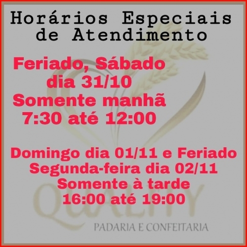 Padaria Quality estará atendendo em horário diferenciado neste sábado, domingo e segunda. Confira o horário: