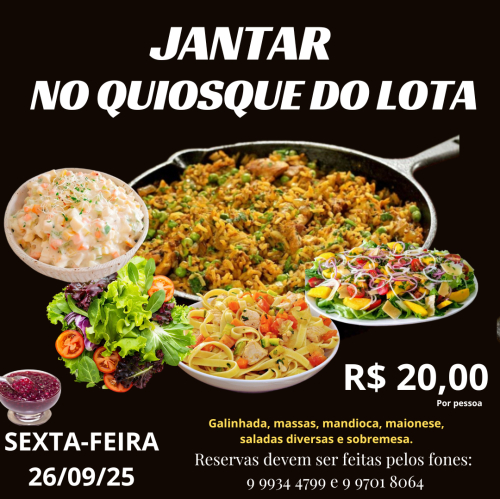 Cardápio: Galinhada, massa, maionese, mandioca, saladas diversas e sobremesa